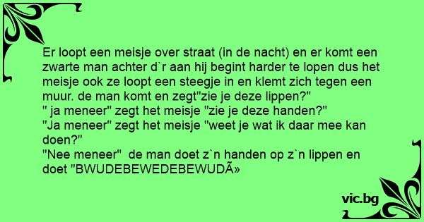 Er loopt een meisje over straat (in de nacht) en er komt een zwarte man achter d`r aan hij begint harder te lopen dus het meisje ook ze loopt een steegje in en klemt zich tegen een muur. de man komt en zegt"zie je deze lippen?"
