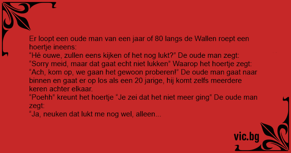 Loopt een oud mannetje op de Amsterdamse wallen. Vraagt een hoer: "Hee opa, zullen we het nog eens proberen?" Zegt opa: Nee meid, dat kan ik niet meer." Zegt die hoer: "Kom kom, we gaan het gewoon...