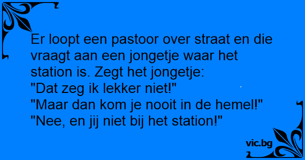 Er loopt een pastoor over straat en die vraagt aan een jongetje waar het station is. Zegt het jongetje: