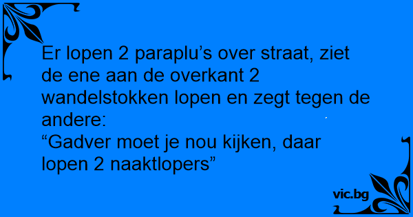 Er lopen 2 paraplu’s over straat, ziet de ene aan de overkant 2 wandelstokken lopen en zegt tegen de andere: