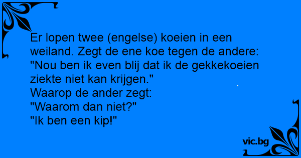 Er lopen twee (engelse) koeien in een weiland. Zegt de ene koe tegen de andere:<br />"Nou ben ik even blij dat ik de gekkekoeien ziекте niet kan krijgen."<br />Waarop de ander zegt:<br />"Waarom dan niet?"<br />"Ik ben een kip!"