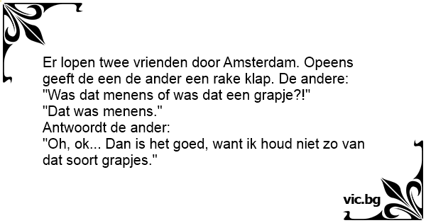 Er lopen twee vrienden door Amsterdam. Opeens geeft de een de ander een rake klap. De andere: