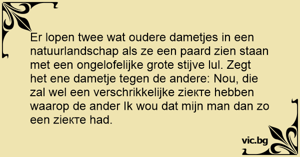 Er lopen twee wat oudere dametjes in een natuurlandschap als ze een paard zien staan met een ongelofelijke grote stijve lul. Zegt het ene dametje tegen de andere: Nou, die zal wel een verschrikkelijke ziекте hebben waarop de ander Ik wou dat mijn man dan zo een ziекте had.