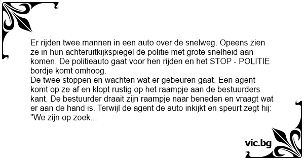 Er rijden twee mannen in een auto over de snelweg. Opeens zien ze in hun achteruitkijkspiegel de politie met grote snelheid aan komen. De politieauto gaat voor hen rijden en het STOP - POLITIE bordje komt omhoog.