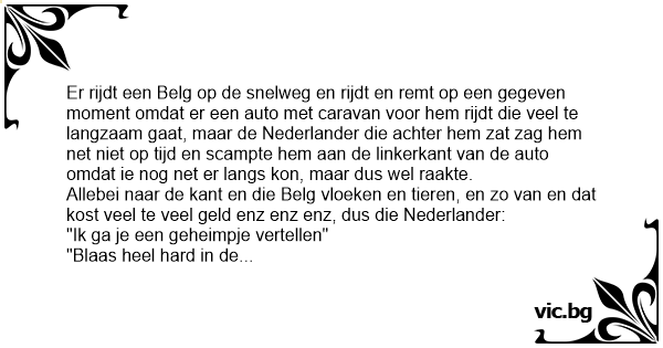 Er rijdt een Belg op de snelweg en rijdt en remt op een gegeven moment omdat er een auto met caravan voor hem rijdt die veel te langzaam gaat, maar de Nederlander die achter hem zat zag hem net niet op tijd en scampte hem aan de linkerkant van de auto omdat ie nog net er langs kon, maar dus wel raakte.