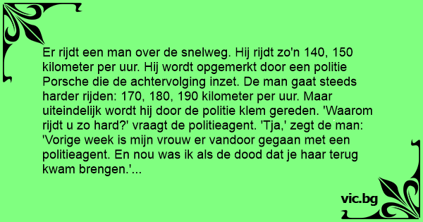 Er rijdt een man over de snelweg. Hij rijdt zo'n 140, 150 kilometer per uur. Hij wordt opgemerkt door een politie Porsche die de achtervolging inzet. De man gaat steeds harder rijden: 170, 180, 190 kilometer per uur. Maar uiteindelijk wordt hij door de politie klem gereden. 'Waarom rijdt u zo hard?' vraagt de politieagent. 'Tja,' zegt de man: