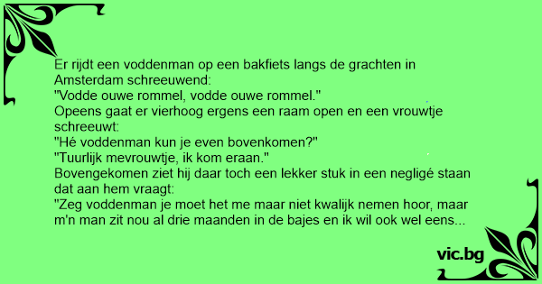 "He, he, dat was lekker, dat had ik echt nodig. Hier voddenman dit is voor U", en ze stopt hem een envelop in zijn hand. Beneden op de bakfiets rijdt de voddenman weer schreeuwend verder. "Vodde ouwe rommel, vodde ouwe rommel."