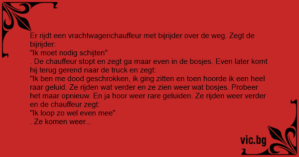 . De chauffeur stopt en zegt ga maar even in de bosjes. Even later komt hij terug gerend naar de truck en zegt: