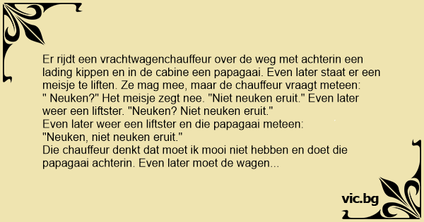 De chauffeur loopt naar achteren en hoort de papagaai zeggen: