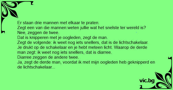 Drie mannen praten samen over snelheid. Zegt de eerste: "Volgens mij is de bliksem het snelste op de wereld. Want je ziet ziet hem al voordat je de donder hoort." "Welnee," zegt de tweede, "het...