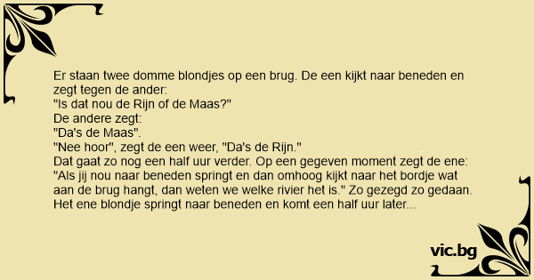 "Als jij nou naar beneden springt en dan omhoog kijkt naar het bordje wat aan de brug hangt, dan weten we welke rivier het is." Zo gezegd zo gedaan. Het ene blondje springt naar beneden en komt een half uur later weer terug. Ze zit helemaal onder de schrammen, heeft haar linker arm gebroken en allebei d'r benen. "En, was het nou de Maas of de Rijn"? "Geen van beide, het was de A2!