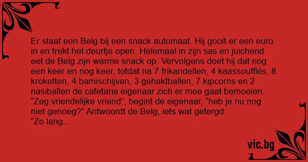 Er staat een Belg bij een snack automaat. Hij gooit er een euro in en trekt het deurtje open. Helemaal in zijn sas en juichend eet de Belg zijn warme snack op. Vervolgens doet hij dat nog een keer en nog keer, totdat na 7 frikandellen, 4 kaassoufflés, 8 kroketten, 4 bamischijven, 3 gehaktballen, 7 kipcorns en 2 nasiballen de cafetaria eigenaar zich er mee gaat bemoeien. “Zeg vriendelijke vriend”, begint de eigenaar, “heb je nu nog niet genoeg?” Antwoordt de Belg, iets wat getergd: