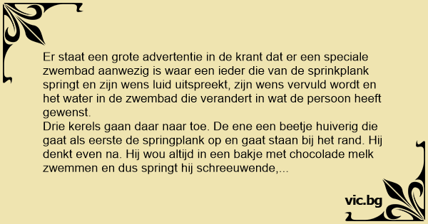 Er staat een grote advertentie in de krant dat er een speciale zwembad aanwezig is waar een ieder die van de sprinkplank springt en zijn wens luid uitspreekt, zijn wens vervuld wordt en het water in de zwembad die verandert in wat de persoon heeft gewenst.