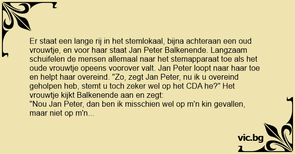 Er staat een lange rij in het stemlokaal, bijna achteraan een oud vrouwtje, en voor haar staat Jan Peter Balkenende. Langzaam schuifelen de mensen allemaal naar het stemapparaat toe als het oude vrouwtje opeens voorover valt. Jan Peter loopt naar haar toe en helpt haar overeind. "Zo, zegt Jan Peter, nu ik u overeind geholpen heb, stemt u toch zeker wel op het CDA he?" Het vrouwtje kijkt Balkenende aan en zegt:
