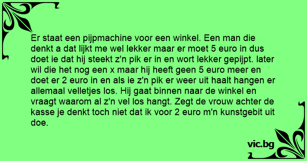 Er staat een pijpmachine voor een winkel. Een man die denkt a dat lijkt me wel lekker maar er moet 5 euro in dus doet ie dat hij steekt z'n pik er in en wort lekker gepijpt. later wil die het nog een x maar hij heeft geen 5 euro meer en doet er 2 euro in en als ie z'n pik er weer uit haalt hangen er allemaal velletjes los. Hij gaat binnen naar de winkel en vraagt waarom al z'n vel los hangt. Zegt de vrouw achter de kasse je denkt toch niet dat ik voor 2 euro m'n kunstgebit uit doe.