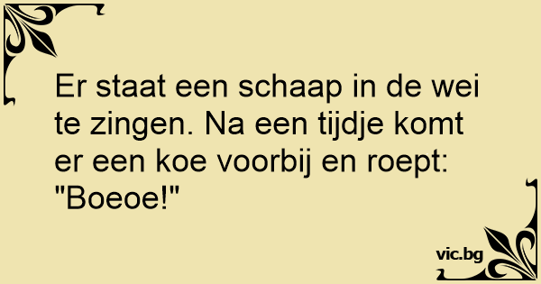 Er staat een schaap in de wei te zingen. Na een tijdje komt er een koe voorbij en roept: