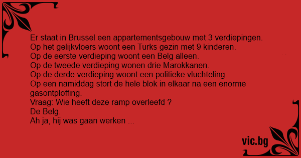 Een Kosovaar loopt rond de middag over straat in een Belgische stad. Hij komt een man tegen. Hij houdt deze man staande en zegt : "Ah, meneer de Belg, bedankt dat ik hier in uw mooie land mag...