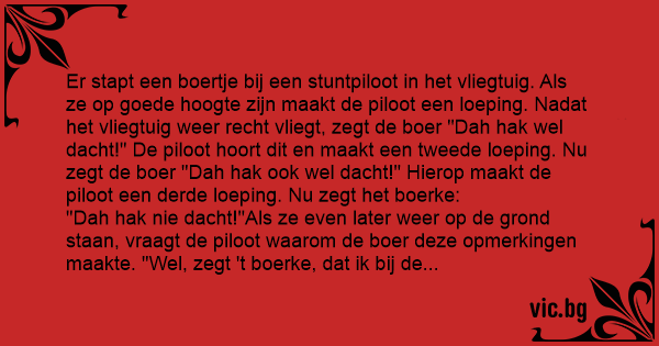 Er stapt een boertje bij een stuntpiloot in het vliegtuig. Als ze op goede hoogte zijn maakt de piloot een loeping. Nadat het vliegtuig weer recht vliegt, zegt de boer "Dah hak wel dacht!" De piloot hoort dit en maakt een tweede loeping. Nu zegt de boer "Dah hak ook wel dacht!" Hierop maakt de piloot een derde loeping. Nu zegt het boerke: