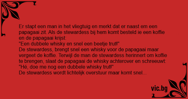 Ne man zit met ne papagaai in een vliegtuig en wil wat drinken. Hij vraagt aan de stewardess: "mag ik een koffie?" De stewardess reageert niet. Dan roept de papagaai: "hé, kutwijf, een koffie en...