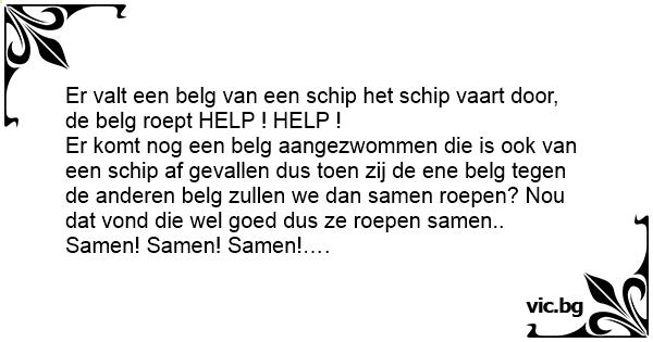 Er komt nog een belg aangezwommen die is ook van een schip af gevallen dus toen zij de ene belg tegen de anderen belg zullen we dan samen roepen? Nou dat vond die wel goed dus ze roepen samen..