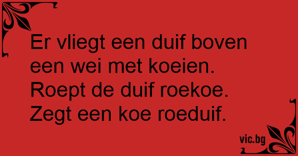 Er vliegt een duif boven een wei met koeien. Roept de duif roekoe. Zegt een koe roeduif.