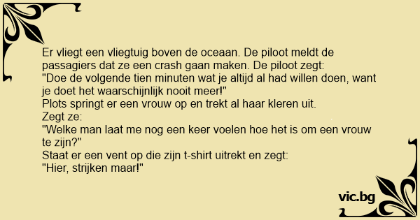 Er vliegt een vliegtuig boven de oceaan. De piloot meldt de passagiers dat ze een crash gaan maken. De piloot zegt: