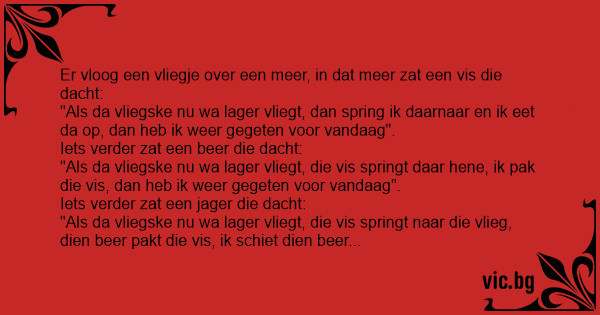 "Als da vliegske nu wa lager vliegt, die vis pakt da vliegske, dien вееr pakt die vis, die jager schiet dien вееr dood, dan pak ik die kruimeltjes die van de jager zen schouders vallen en dan hebik weer gegeten voor vandaag".
