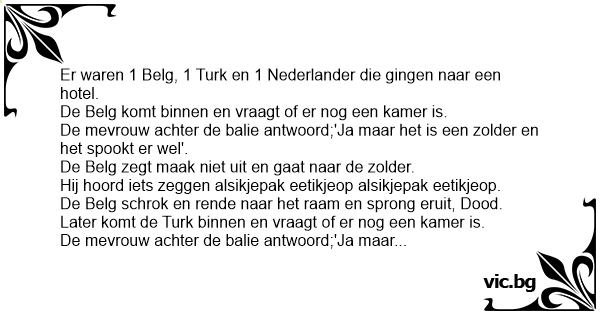 Er waren 1 Belg, 1 Turk en 1 Nederlander die gingen naar een hotel.