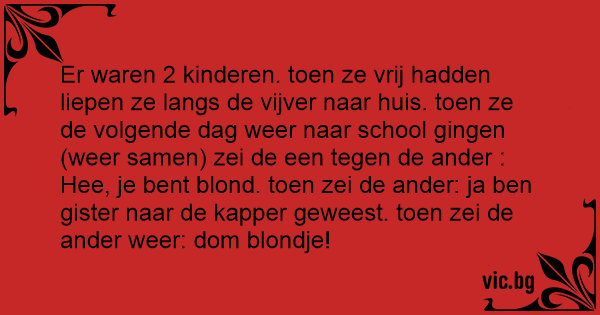Er waren 2 kinderen. toen ze vrij hadden liepen ze langs de vijver naar huis. toen ze de volgende dag weer naar school gingen(weer samen) zei de een tegen de ander : Hee, je веnт blond. toen zei de ander: ja ben gister naar de kapper geweest. toen zei de ander weer: dom blondje!