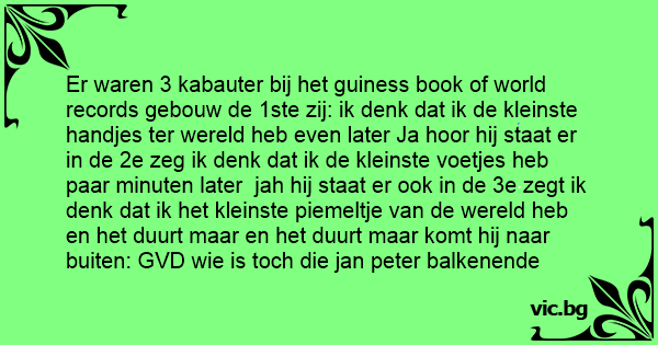 Er waren 3 kabauter bij het guiness book of world records gebouw de 1ste zij: ik denk dat ik de kleinste handjes ter wereld heb even later Ja hооr hij staat er in de 2e zeg ik denk dat ik de kleinste voetjes heb paar minuten later jah hij staat er ook in de 3e zegt ik denk dat ik het kleinste piemeltje van de wereld heb en het duurt maar en het duurt maar komt hij naar buiten: GVD wie is toch die jan peter balkenende