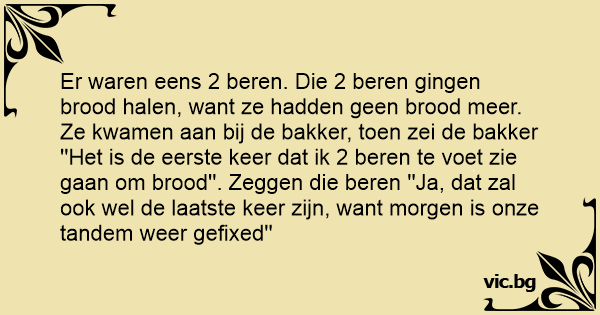 Er waren eens 2 beren. Die 2 beren gingen brood halen, want ze hadden geen brood meer. Ze kwamen aan bij de bakker, toen zei de bakker ''Het is de eerste keer dat ik 2 beren te voet zie gaan om brood''. Zeggen die beren ''Ja, dat zal ook wel de laatste keer zijn, want morgen is onze tandem weer gefixed''