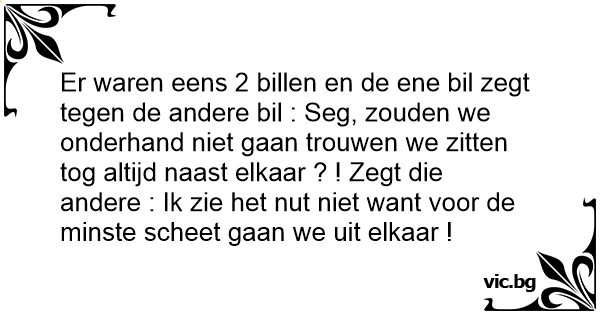 Er waren eens 2 billen en de ene bil zegt tegen de andere bil : Seg, zouden we onderhand niet gaan trouwen we zitten tog altijd naast elkaar ? ! Zegt die andere : Ik zie het nut niet want voor de minste scheet gaan we uit elkaar !