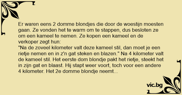 Er waren eens 2 domme blondjes die door de woestijn moesten gaan. Ze vonden het te warm om te stappen, dus besloten ze om een kameel te nemen. Ze kopen een kameel en de verkoper zegt hun: