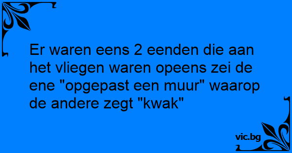 Er waren eens 2 eenden die aan het vliegen waren opeens zei de ene "opgepast een muur" waarop de andere zegt "kwak"