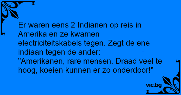 Er waren eens 2 Indianen op reis in Amerika en ze kwamen electriciteitskabels tegen. Zegt de ene indiaan tegen de ander:<br />"Amerikanen, rare mensen. Draad veel te hoog, koeien kunnen er zo onderdoor!"