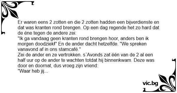 Er waren eens 2 zotten en die 2 zotten hadden een bijverdienste en dat was kranten rond brengen. Op een dag regende het zo hard dat de éne tegen de andere zei: