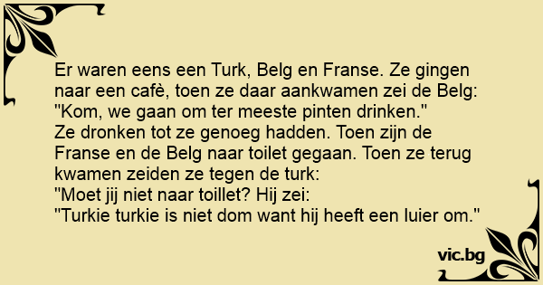Er waren eens een Turk, Belg en Franse. Ze gingen naar een cafè, toen ze daar aankwamen zei de Belg: