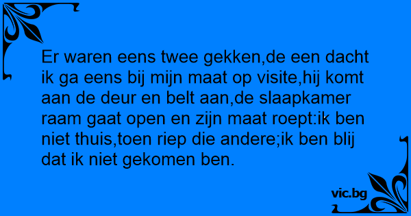 Er waren eens twee gekken,de een dacht ik ga eens bij mijn maat op visite,hij komt aan de deur en belt aan,de slaapkamer raam gaat open en zijn maat roept:ik ben niet thuis,toen riep die andere;ik ben blij dat ik niet gekomen ben.