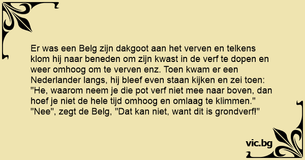 Er was een Belg zijn dakgoot aan het verven en telkens klom hij naar beneden om zijn kwast in de verf te dopen en weer omhoog om te verven enz. Toen kwam er een Nederlander langs, hij bleef even staan kijken en zei toen: