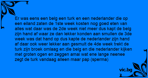 Er was eens een belg een turk en een nederlander die op een eiland zaten de 1ste week kosten nog goed eten van alles wat daar was de 2de week niet meer dus kapt de belg zijn hand af waar ze dan lekker konden aan smullen de 3de week was dat hand op dus kapte de nederlander zijn hand af daar ook weer lekker aan gesmult de 4de week trekt de turk zijn broek omlaag en die belg en die nederlander kijken met groten ogen en zeggen amai wat ene lange neenee zegt de turk vandaag alleen maar pap (sperma)