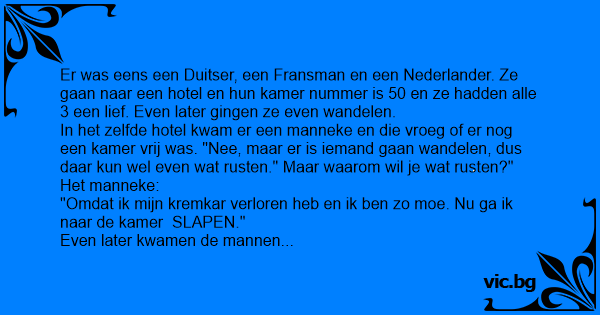 Er was eens een Duitser, een Fransman en een Nederlander. Ze gaan naar een hotel en hun kamer nummer is 50 en ze hadden alle 3 een lief. Even later gingen ze even wandelen.