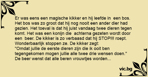 Een magische kikker loopt door een heel groot magisch bos en dat bos is zo groot dat de kikker nog nooit een dier heeft gezien. Dan rent er ineens een beer achter een konijn aan. "Stop!" roept de...