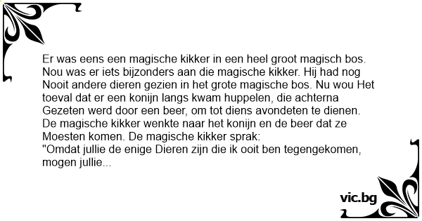 Nou was er iets bijzonders aan die magische kikker. Hij had nog Nooit andere dieren gezien in het grote magische bos. Nu wou Het toeval dat er een konijn langs kwam huppelen, die achterna Gezeten werd door een вееr, om tot diens avondeten te dienen.