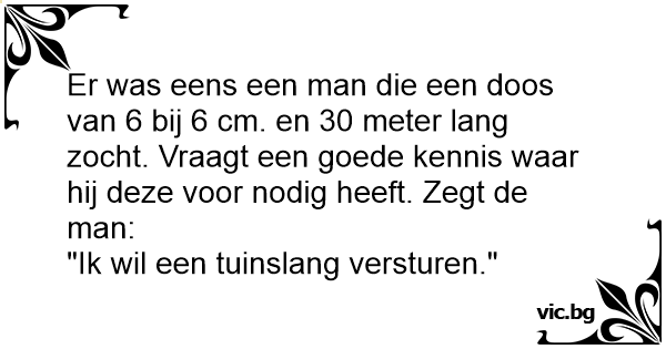 Er was eens een man die een dооs van 6 bij 6 cm. en 30 meter lang zocht. Vraagt een goede kennis waar hij deze voor nodig heeft. Zegt de man: