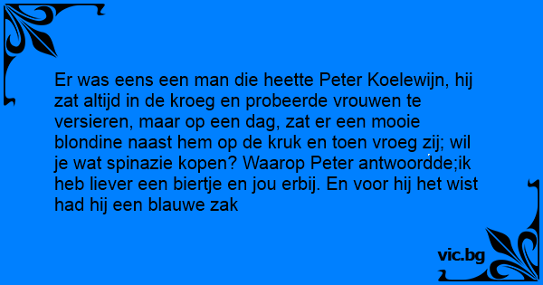 Er was eens een man die heette Peter Koelewijn, hij zat altijd in de kroeg en probeerde vrouwen te versieren, maar op een dag, zat er een mooie blondine naast hem op de kruk en toen vroeg zij; wil je wat spinazie kopen? Waarop Peter antwoordde;ik heb liever een biertje en jou erbij. En voor hij het wist had hij een blauwe zak