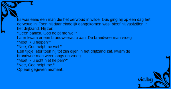 Een man staat tot z'n knieen in het water, komt er een speetboot aan en stopt even om de man uit het water te halen. Zegt de man in het water: "Nee, dat hoeft niet want god komt mij redden." Poosje...