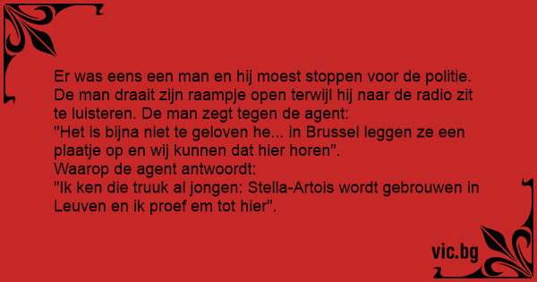 Er was eens een man en hij moest stoppen voor de politie. De man draait zijn raampje open terwijl hij naar de radio zit te luisteren. De man zegt tegen de agent: