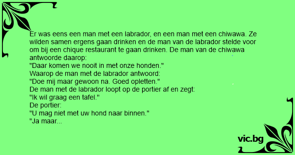 Er was eens een man met een labrador, en een man met een chiwawa. Ze wilden samen ergens gaan drinken en de man van de labrador stelde voor om bij een chique restaurant te gaan drinken. De man van de chiwawa antwoorde daarop: