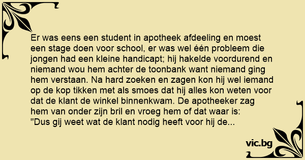 Er was eens een student in apotheek afdeeling en moest een stage doen voor school, er was wel één probleem die jongen had een kleine handicapt; hij hakelde voordurend en niemand wou hem achter de toonbank want niemand ging hem verstaan. Na hard zoeken en zagen kon hij wel iemand op de кор tikken met als smoes dat hij alles kon weten voor dat de klant de winkel binnenkwam. De apotheeker zag hem van onder zijn bril en vroeg hem of dat waar is: