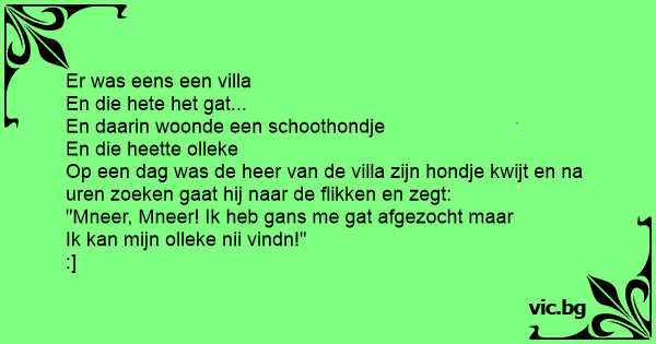 Op een dag was de heer van de villa zijn hondje kwijt en na uren zoeken gaat hij naar de flikken en zegt: